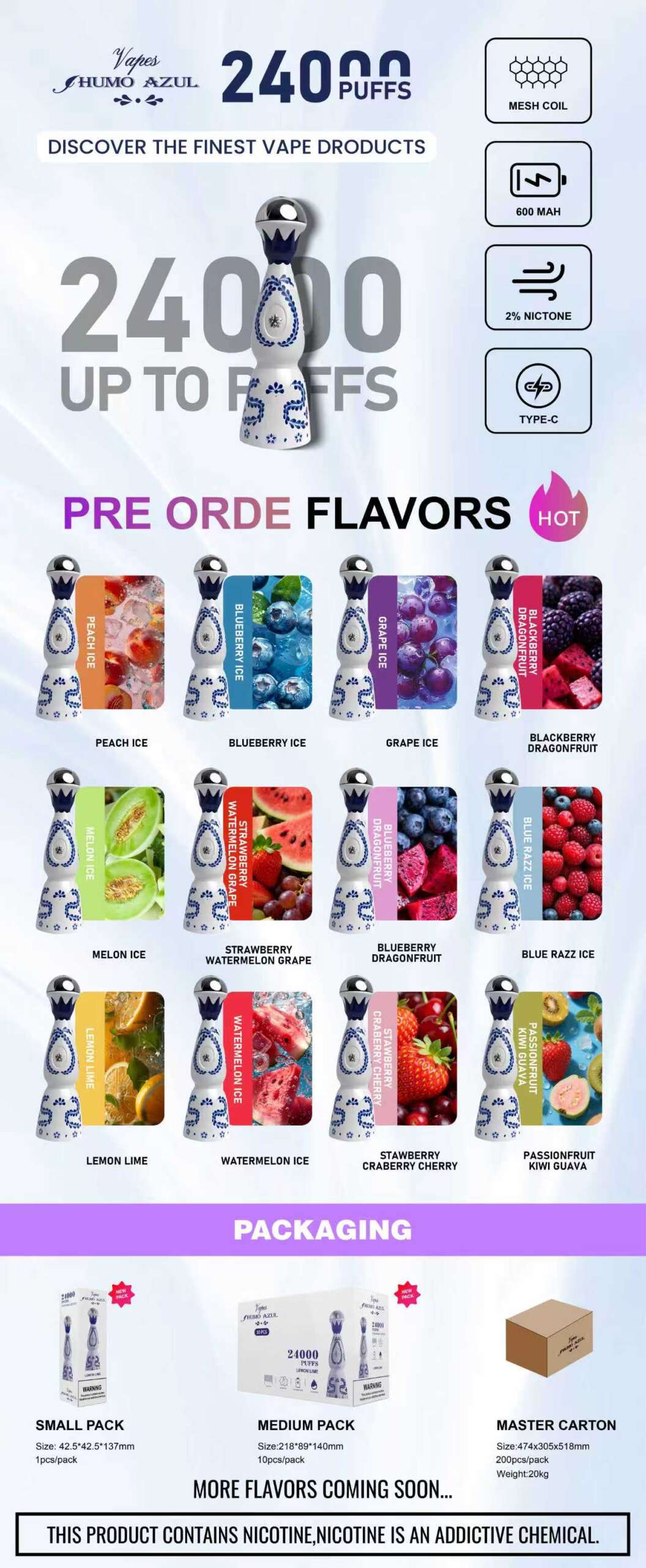 ·High Demand, Low Risk: 15,000-puff devices are one of the fastest-growing categories in vaping – customers love the long-lasting value. The Humo AZUL ’s unique blue design and reliable performance stand out in a crowded market, driving repeat purchases.